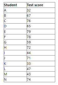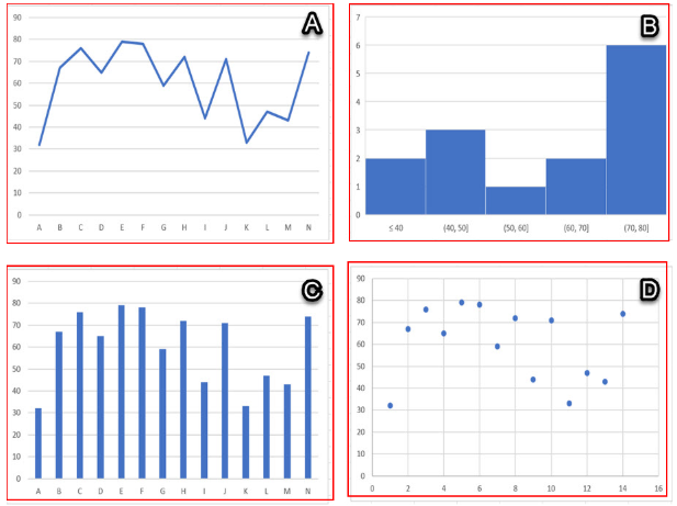 นักเรียนบ่นว่าข้อสอบที่เพิ่งสอบไปนั้นยากเกินไป อาจารย์ผู้สอนจึงสร้างตารางที่แสดงคะแนนสอบของนักเรียนแต่ละคนขึ้นมา (ดังภาพ) การแสดงผลข้อมูลแบบใดที่จะช่วยให้อาจารย์มองเห็นการกระจายตัวของคะแนนสอบได้ชัดเจนที่สุด