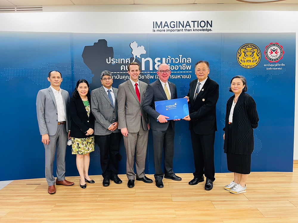 นายวรเทพ มงคลวาที ผู้จัดการทั่วไป บริษัท เออาร์ไอที จำกัด และคณะผู้บริหารจากทาง Certiport ประเทศสหรัฐอเมริกา Mr. Jan Day Vice President of Global Business Development & Strategic Partners พร้อมด้วย Mr. Shawn Moon Principal Product Manager, Strategic Accounts, และ Mr. Mandaar Barve Regional Manager, India and Southeast Asia from Certiport, a Pearson VUE Business เข้าพบท่านสุรพล พลอยสุข ผู้อำนวยการสถาบันคุณวุฒิวิชาชีพ พร้อมด้วยคุณวรชนาธิป จันทนู และคุณจุลลดา มีจุล รองผู้อำนวยการสถาบันคุณวุฒิวิชาชีพ เพื่อหารือถึงแนวทางความร่วมมือ ด้านการพัฒนาทักษะด้านดิจิทัลให้กับกำลังคนของไทยโดย Certiport เป็นหนึ่งในผู้ให้บริการด้าน Certification Exams ผ่านศูนย์สอบวัดมาตรฐานความรู้สากล Pearson VUE ที่ได้รับยอมรับด้านมาตรฐานและคุณภาพ ทำงานร่วมกับเครือข่ายตัวแทนทั่วโลก Pearson VUE Authorized Test Centre จาก 148 ประเทศ และ 26 ภาษา รวมถึง Certiport ยังมีความร่วมมือกับ Partner ที่เป็น IT Vendors Certificate ชั้นนำ อาทิ IC3, Adobe , Autodesk, Unity, Microsoft และ Apple เป็นต้น